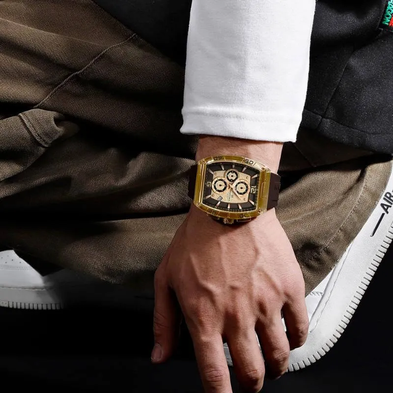 NaviForce NF6101 Men’s Fashion Barrel Dial Shape Transparent Multifunction Silicon Strap Watch – Brown/Rosegold